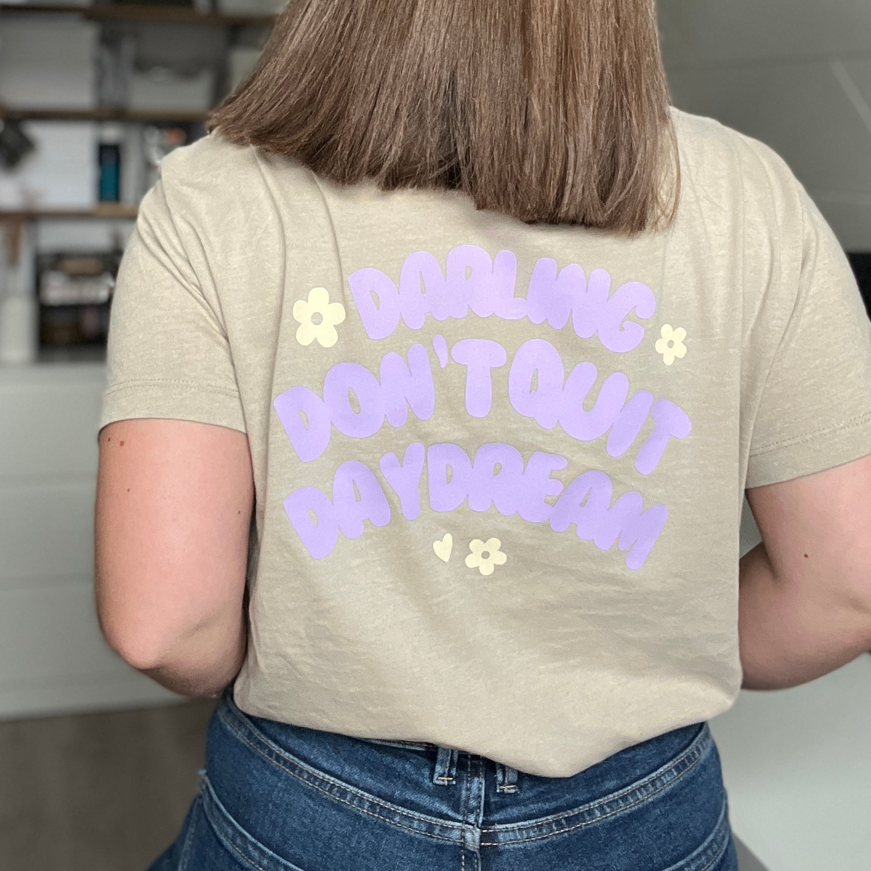 Dieser verspielte Schriftzug mit Blumen- und Herzelementen soll dich daran erinnern, niemals mit dem Tagträumen aufzuhören. Der Spruch macht sich unheimlich gut als Rückenprint von Shirts, auf Taschen oder Kissen - einfach um ein Statement zu setzen. 🙏🏼